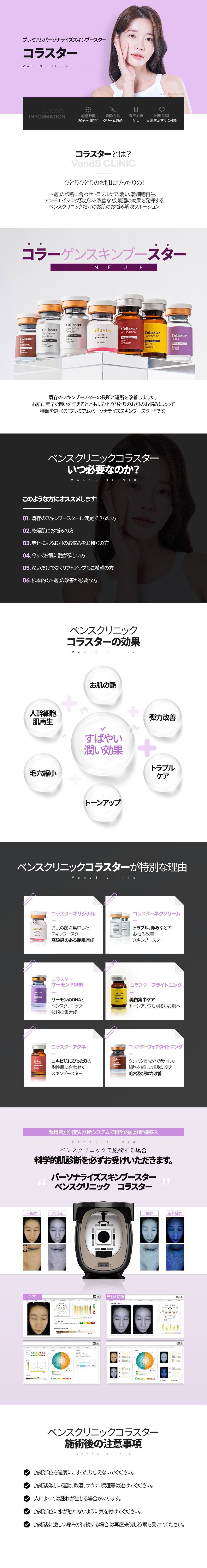 コラスターは、ポテンザ専用の皮膚再生コラーゲンブースターです。 コラーゲン生成を促進し、大容量で肌に十分な水分感を供給して お肌にツヤを与え、お肌の弾力、小じわ、キメの改善にも効果があります。